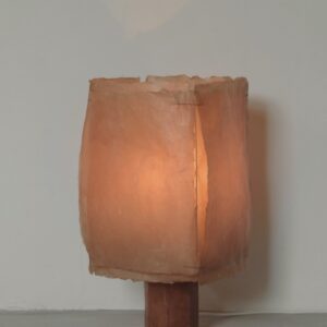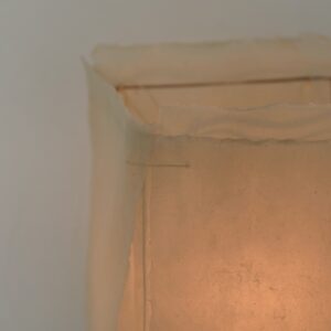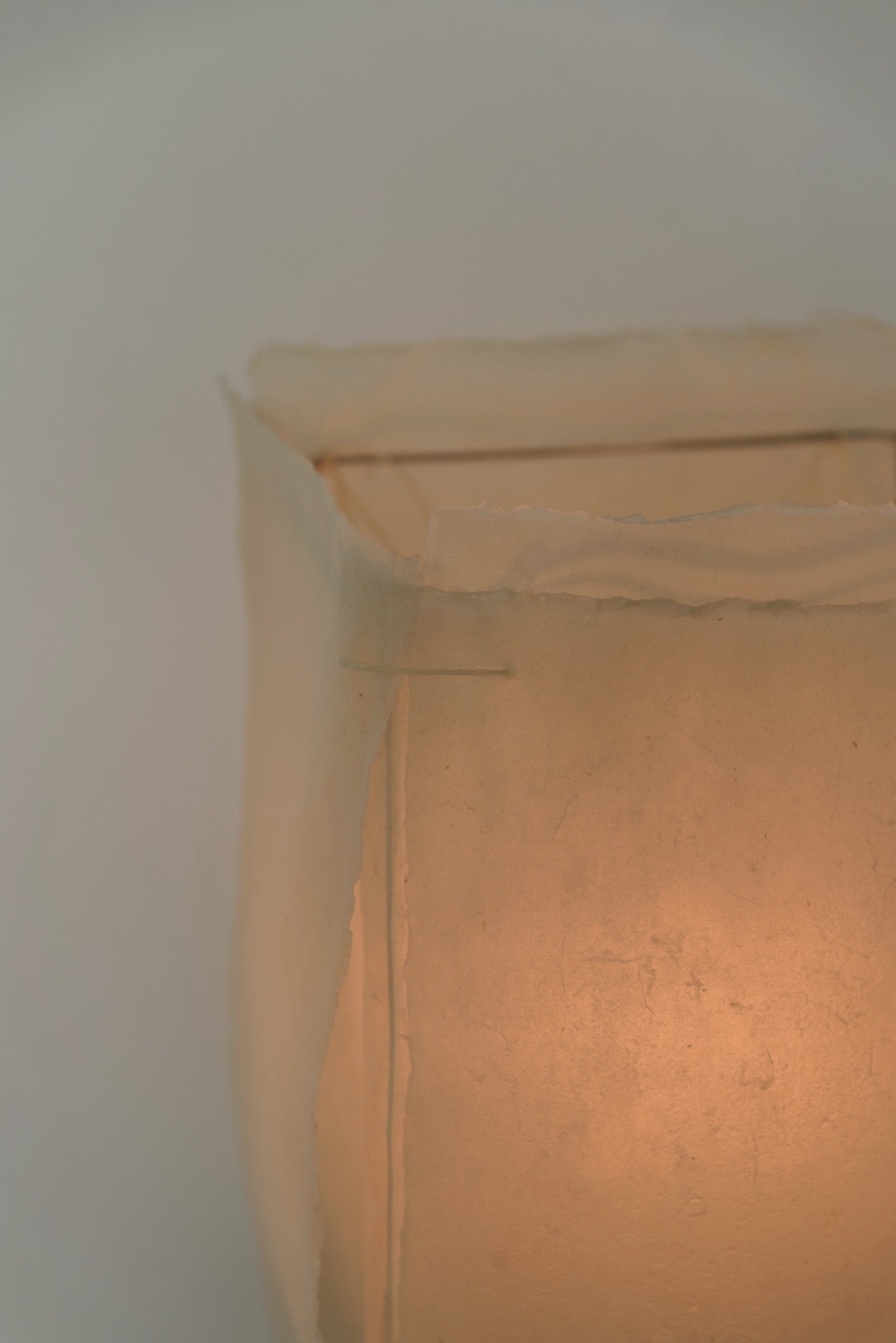 The shade is made of washi paper soaked in wax, incorporating both weaving and knitting.