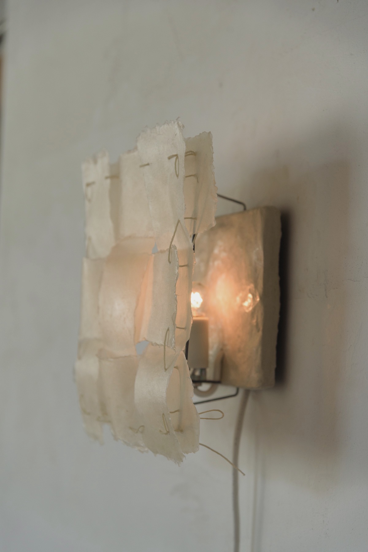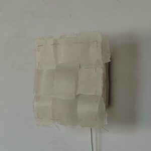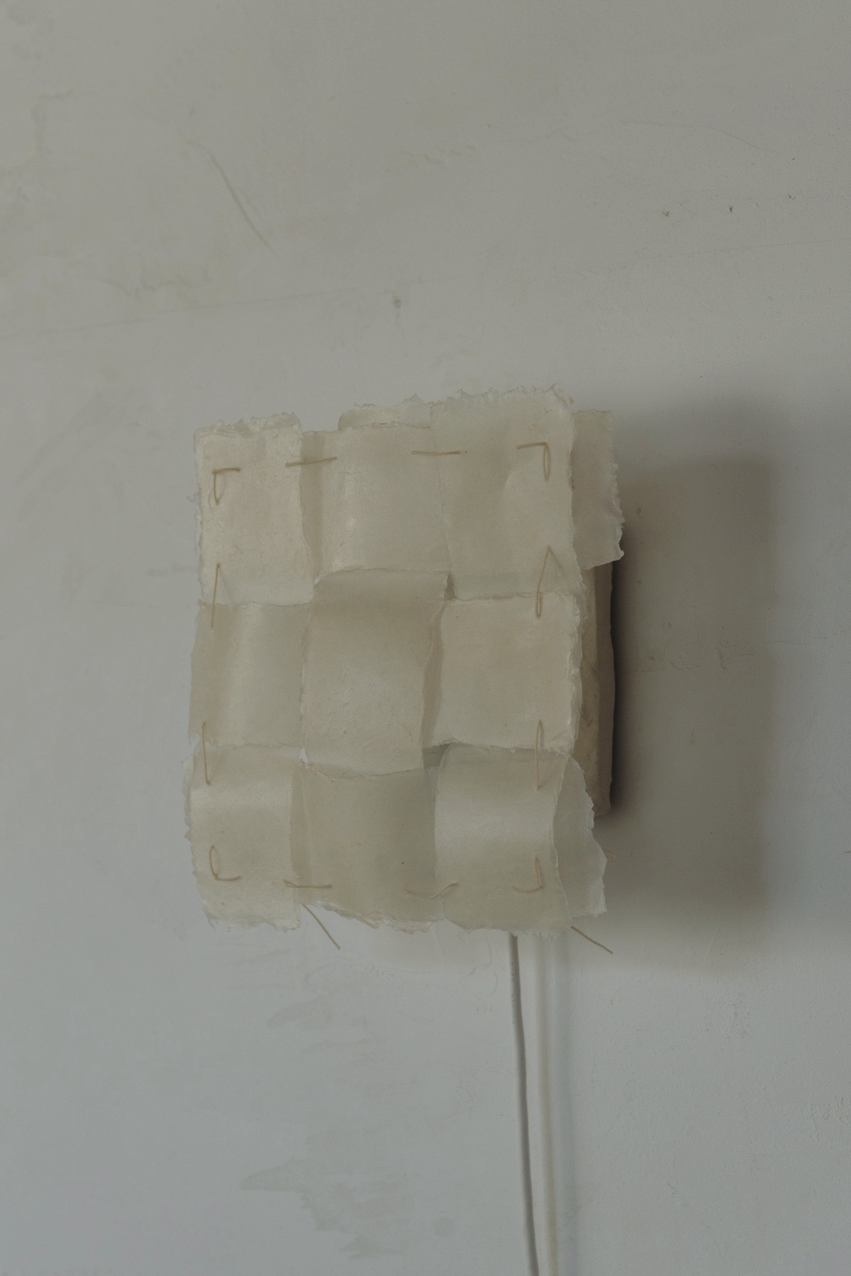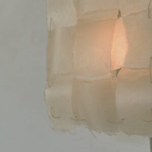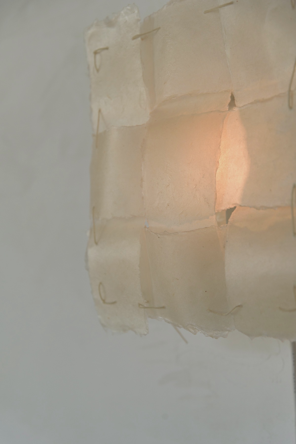 The shade is made of washi paper soaked in wax, incorporating both weaving and knitting.