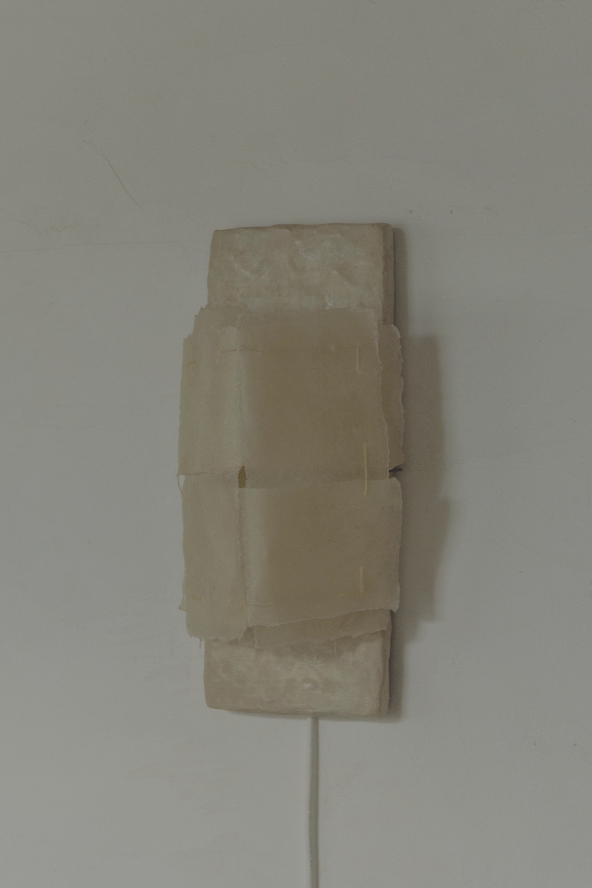 The shade is made of washi paper soaked in wax, incorporating both weaving and knitting.